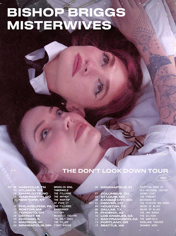 See MisterWives live with Bishop Briggs throughout North America on The Don’t Look Down Tour beginning on September 8 in Nashville, TN. The tour will make its way through the East Coast including New York, NY on September 15 at Pier 17 and stop in Toronto, ON on September 19. The band will then move through the Midwest with a stop in Chicago, IL on September 22 and move West to Denver on October 1 with two Texas dates to follow. On October 10, MisterWives will play The Wiltern in Los Angeles, move through San Francisco, CA and Portland, OR and conclude in Seattle, WA on October 15. Get tickets now via misterwives.com/tour.